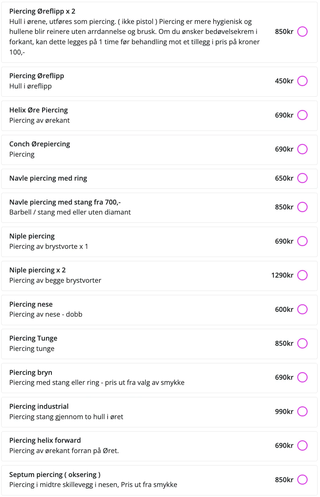 Bestill din gratis piercingkonsultasjon i dag! Klikk på knappene her på siden for å bestille.